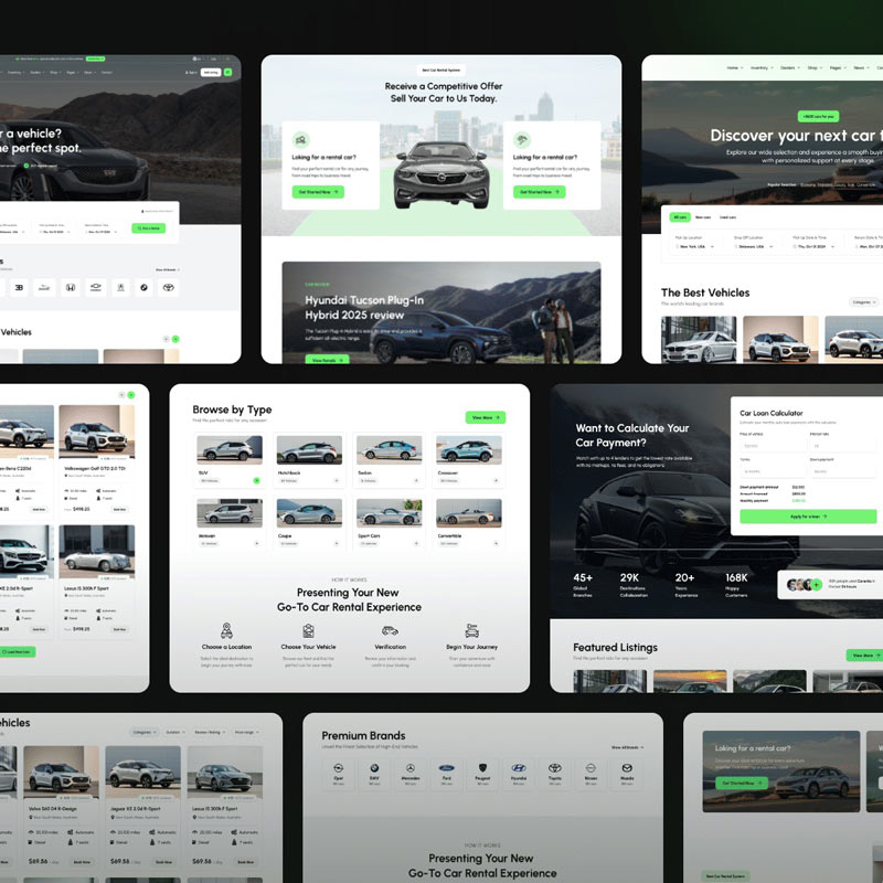 Три уникальных домашние страницы и различные макеты для списков и деталей автомобилей.
