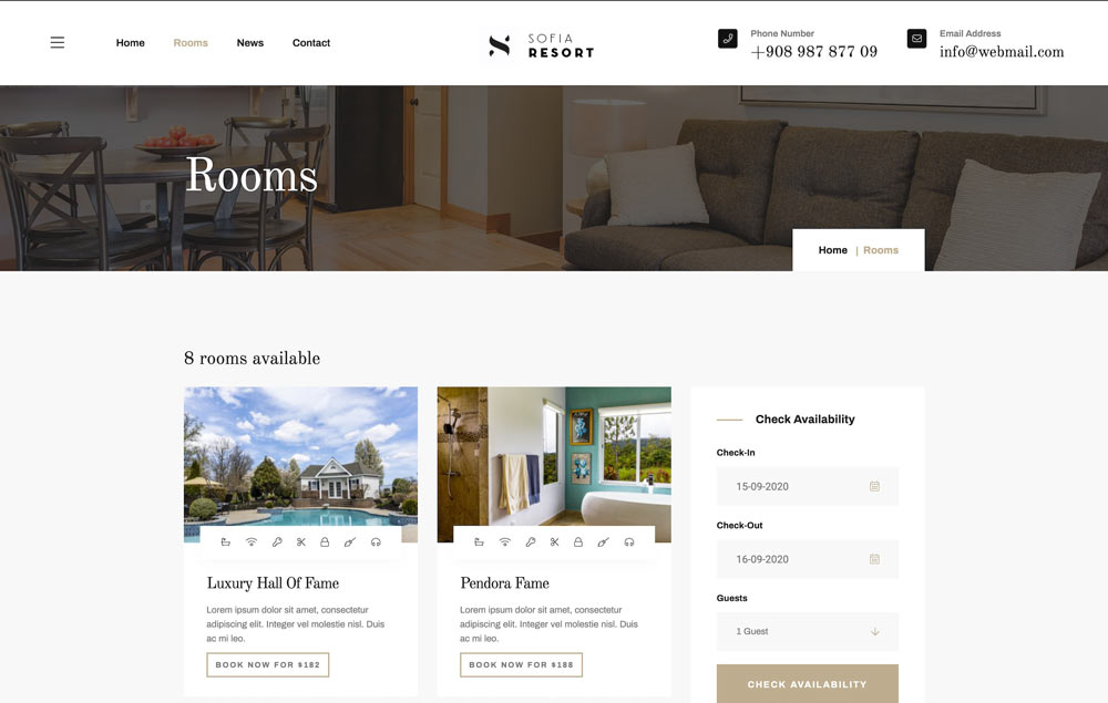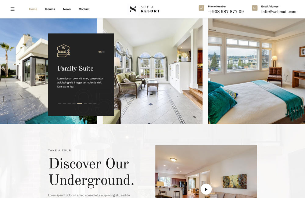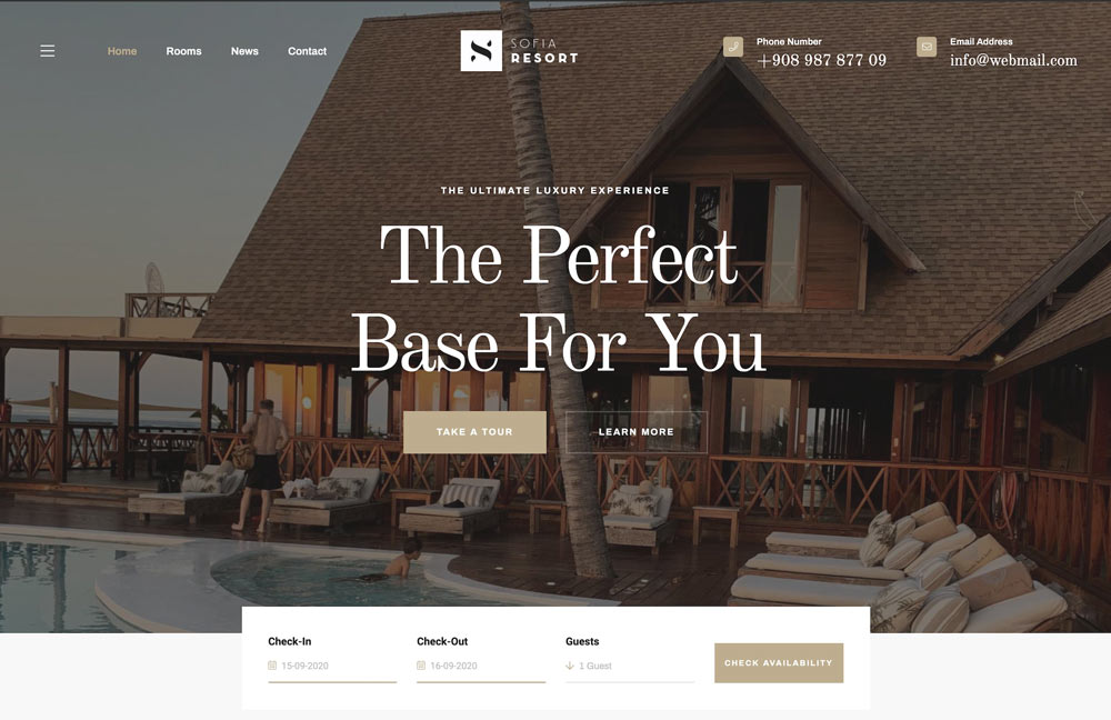 Sofia Resort - готовый сайт Отеля и система бронирования курортов.Sofia Resort - чистый, премиум и современный сценарий бронирования.