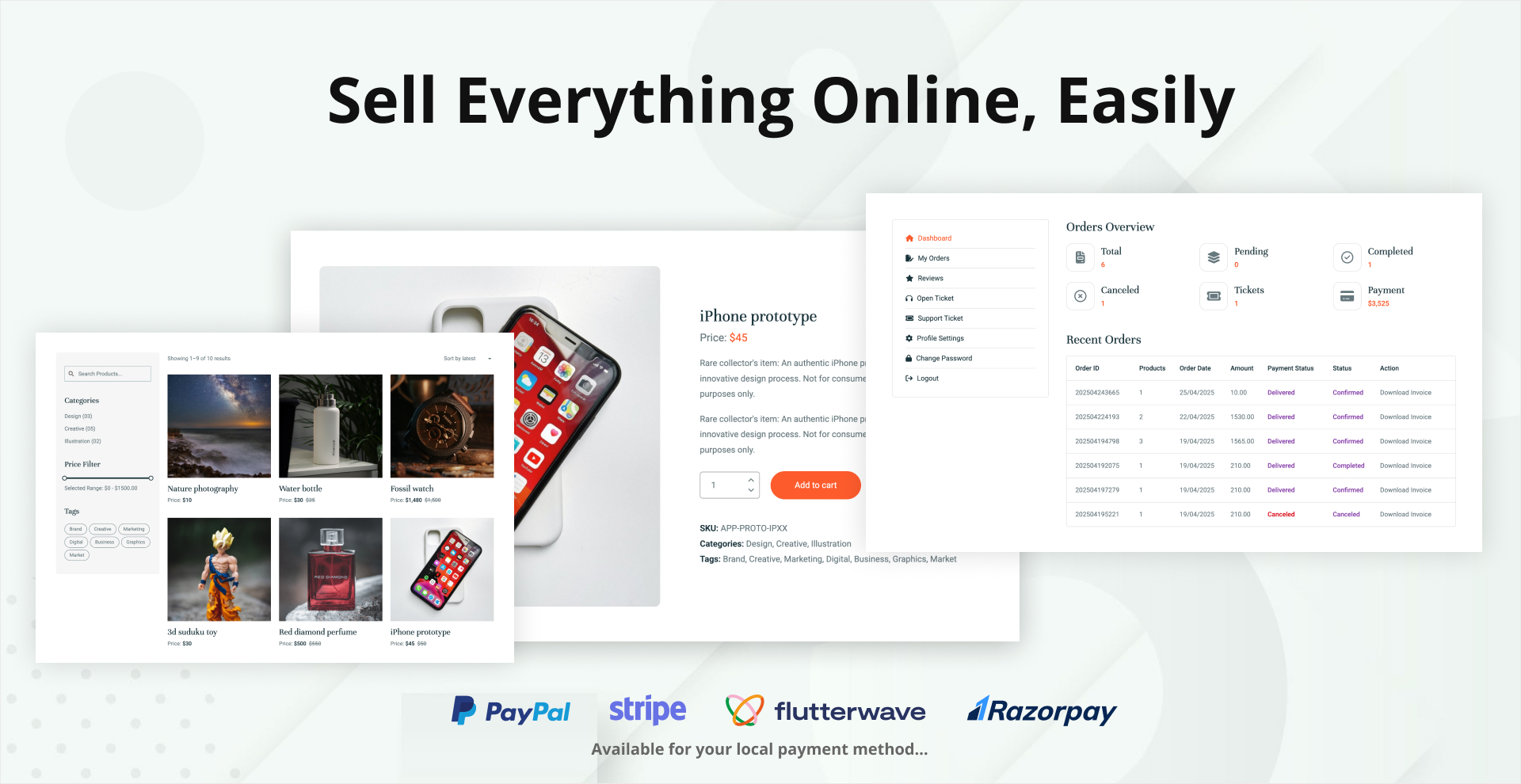 - Поддержка множества способов оплаты: PayPal, Stripe, Razorpay, Flutterwave, SSLCommerz…